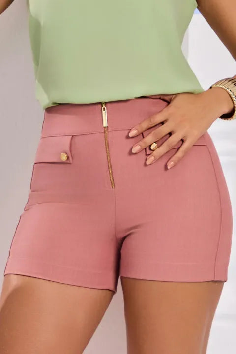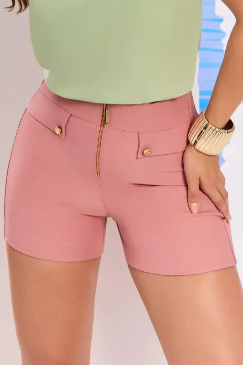 Com fechamento frontal em zíper metálico, que adiciona um charme extra e um ar contemporâneo, o short apresenta recorte reto e cintura alta, favorecendo ainda mais o visual feminino. Na parte frontal, o design conta com detalhes de lapelas decorativas com botões dourados, remetendo ao estilo da alfaiataria clássica. Já na parte traseira, possui bolsos aplicados, que equilibram a funcionalidade com o estilo.