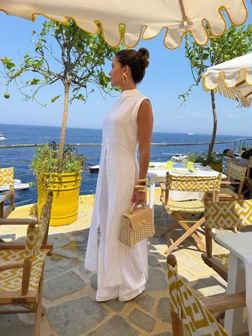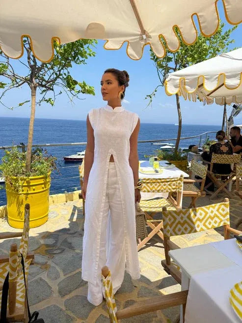 Um conjunto sofisticado que une elegância e modernidade em cada detalhe. A peça conta com túnica longa de corte reto, gola estruturada e fenda frontal que valoriza o caimento, trazendo leveza e movimento. A calça reta completa o visual, criando uma proposta alongada e extremamente refinada.