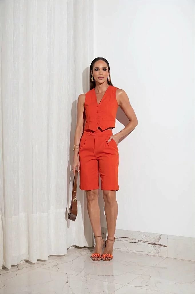 Conjunto composto por colete e bermuda. Colete shape reto com botões encapados e detalhe de bolso alfaiataria fake. Bermuda shape reto, cintura alta, cós médio com botões duplo encapado, pregas e bolso faca logo abaixo do cós.