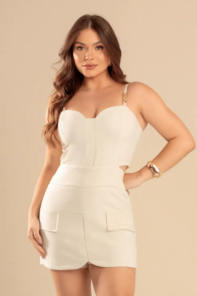 O Macaquinho de Alçinha com Regulador é a escolha ideal para quem deseja aliar conforto e sofisticação. Com um detalhe metalizado que garante um toque de glamour, este macaquinho se destaca pelo seu recorte em forma de coração, valorizando a silhueta feminina de maneira única.