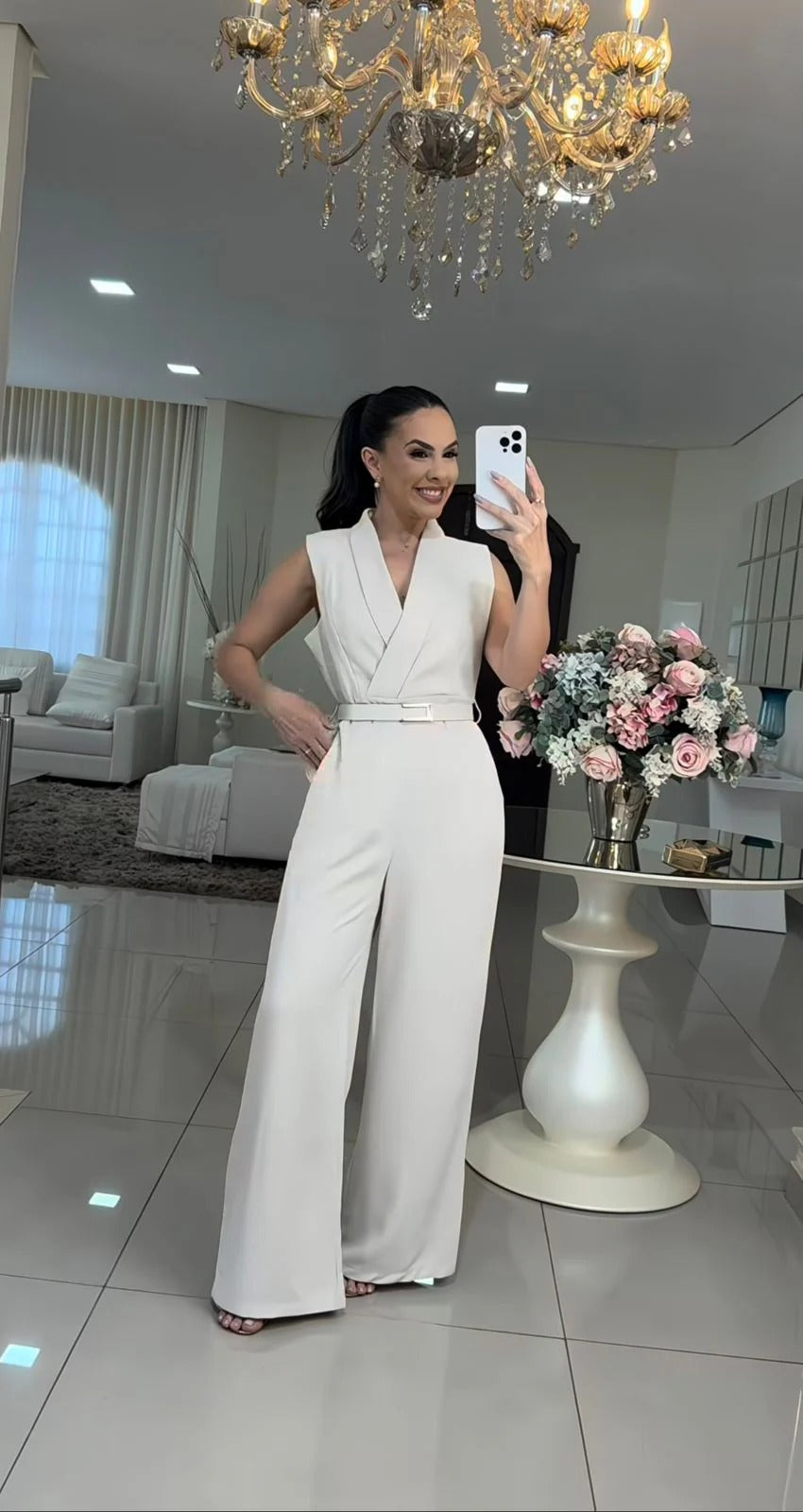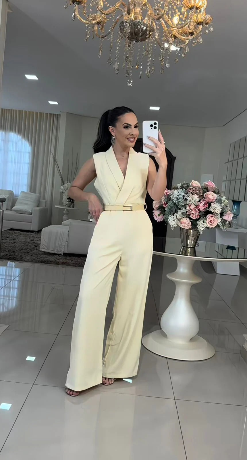 Macacão Rosângela Lima é confeccionado em crepe alfaiataria de alta qualidade com elastano, garantindo caimento impecável, sofisticação e conforto durante todo o uso. Seu design sem mangas, com gola lapela e cinto na cintura, valoriza a silhueta e alonga a figura. A modelagem pantalona traz imponência e leveza ao look, perfeito para ocasiões que pedem elegância e modernidade.