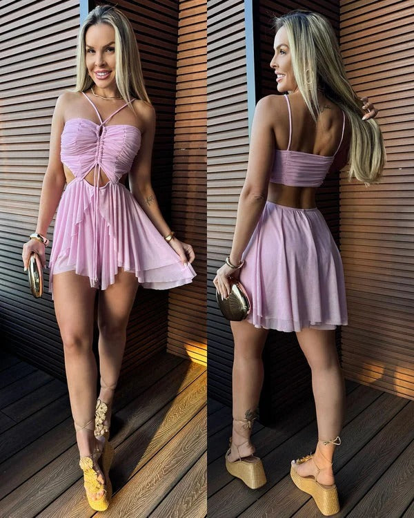 O recorte na cintura cria um efeito moderno e sensual, enquanto a saia com camadas assimétricas traz movimento delicado e um ar sofisticado. A alça fina com detalhe diferenciado dá um toque de charme extra, realçando ainda mais a feminilidade.
