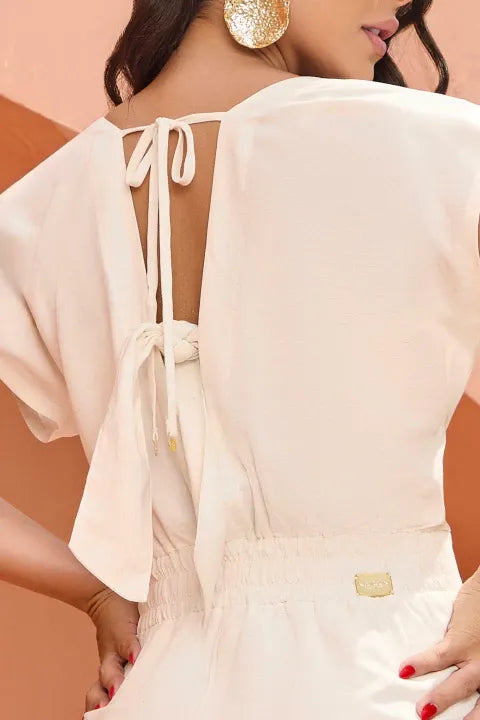 Este macaquinho apresenta fechamento em botão na pala e amarração delicada, que proporcionam um ajuste elegante e personalizado. Acompanha um top interno, tem mangas curtas, garantindo conforto e estilo ao mesmo tempo.
