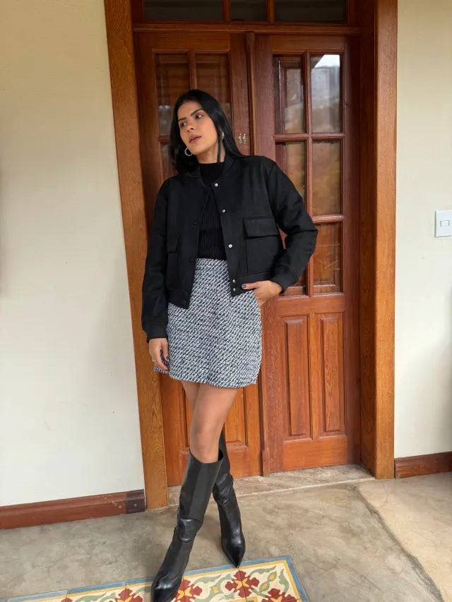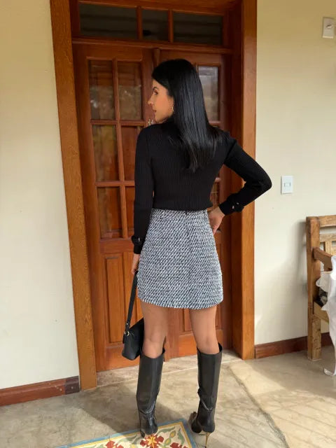 A Saia é confeccionada em tecido tweed de alta qualidade, possui forro para melhor conforto oferecendo um toque discreto, enquanto os passantes médios permitem a adição de um cinto para complementar o look. Possui bolsos faca funcionais proporcionando praticidade e estilo. O zíper invisível na parte de traz garante ajuste perfeito e discreto.