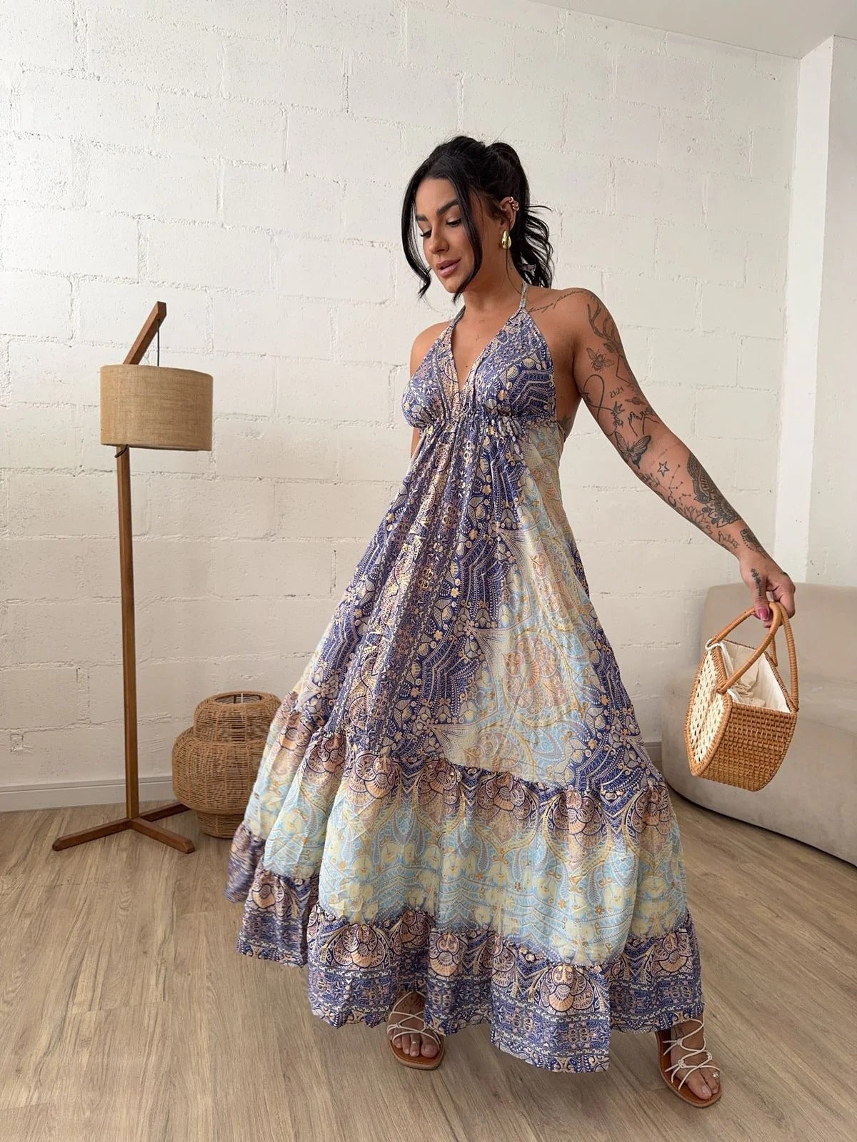 Esse é naquele tecido super fluido, sua composição é 100% viscose, e tem alças que permitem amarrações diferentes.
