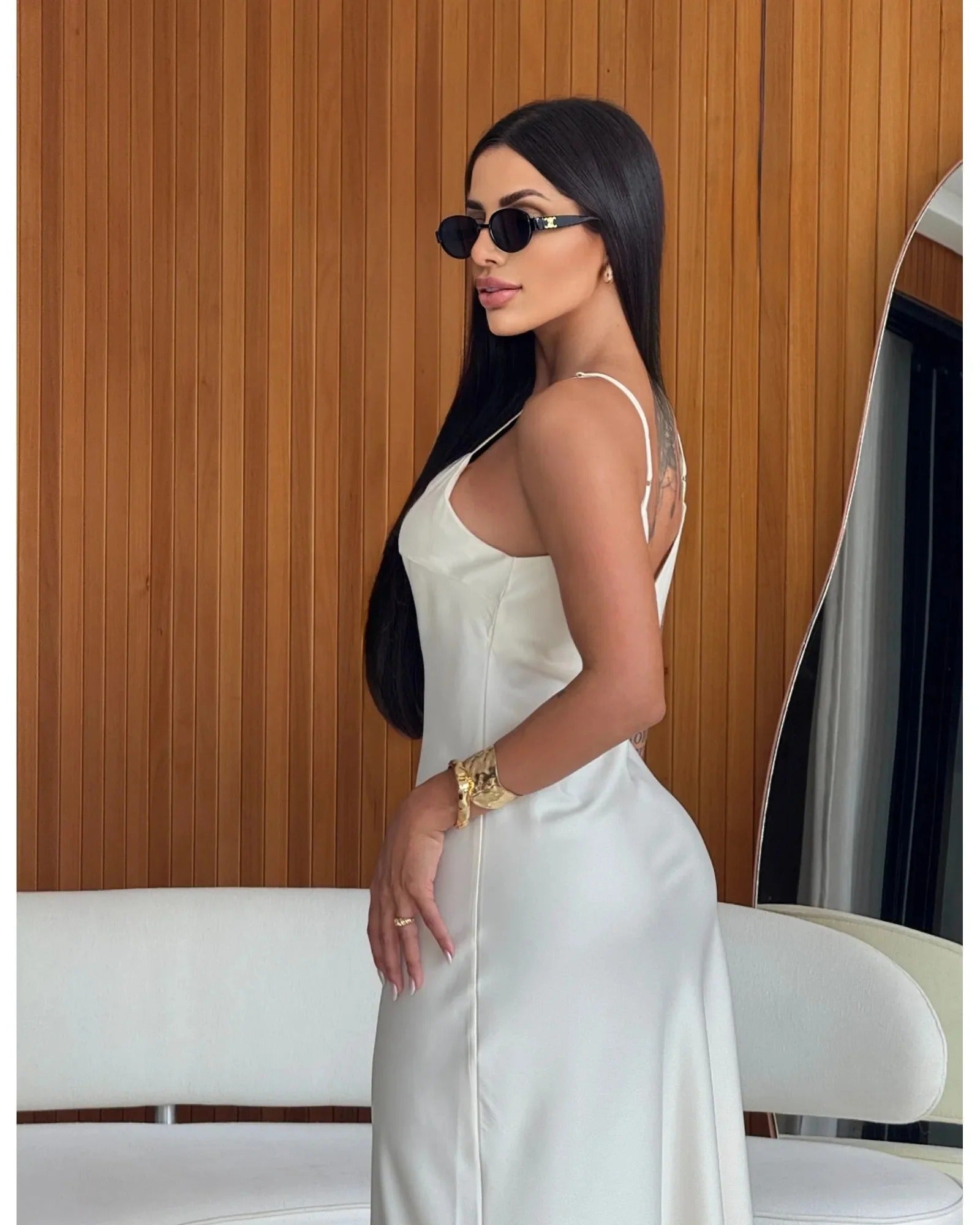 O modelo de alças finas garante leveza e delicadeza, enquanto o corte ajustado ao corpo alonga a figura, realçando a feminilidade de forma elegante. O toque macio do cetim com elastano oferece conforto durante todo o uso, sem perder o acabamento refinado.